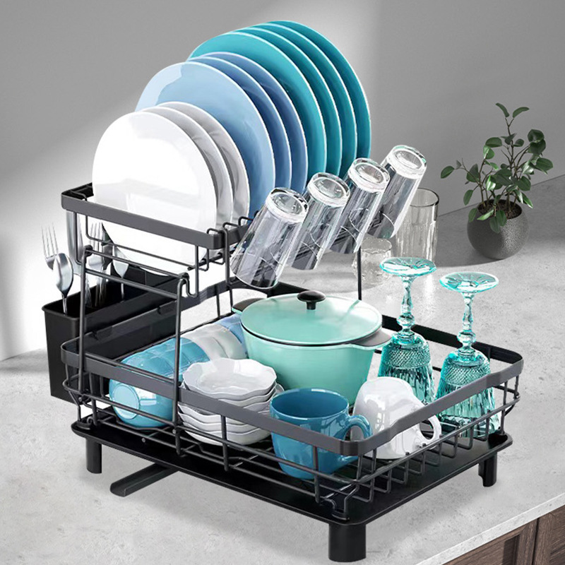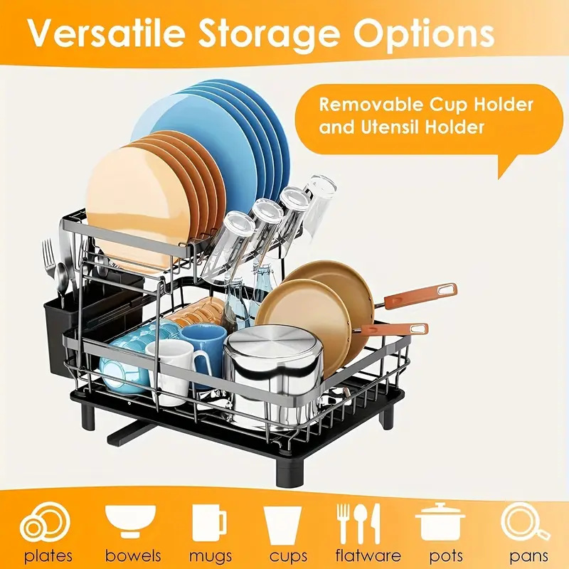 2 Tier Dish Drying Rack for Kitchen Counter Metal Dish Racks Drainers with Knife Cup Utensil Holder